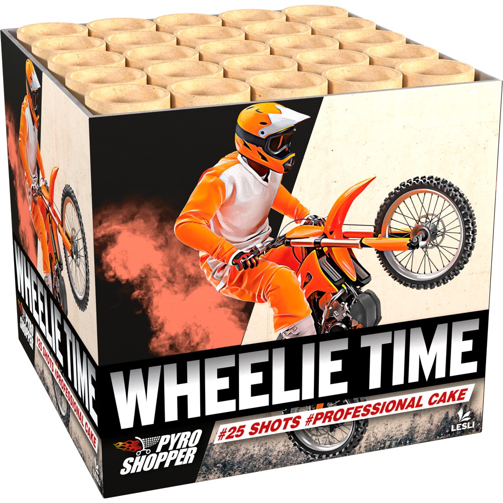 Wheelie TimeDiese leise geschossene 25-Schuss-Batterie schießt professionelle Effekte in die Luft. Der aufmerksame Betrachter wird sehen, wie sich große Farbsterne in großes Brokat verwandeln. Dieser Effekt verändert sich im Flug durch die Luft. Das findet man normalerweise bei Profi-Feuerwerken. |