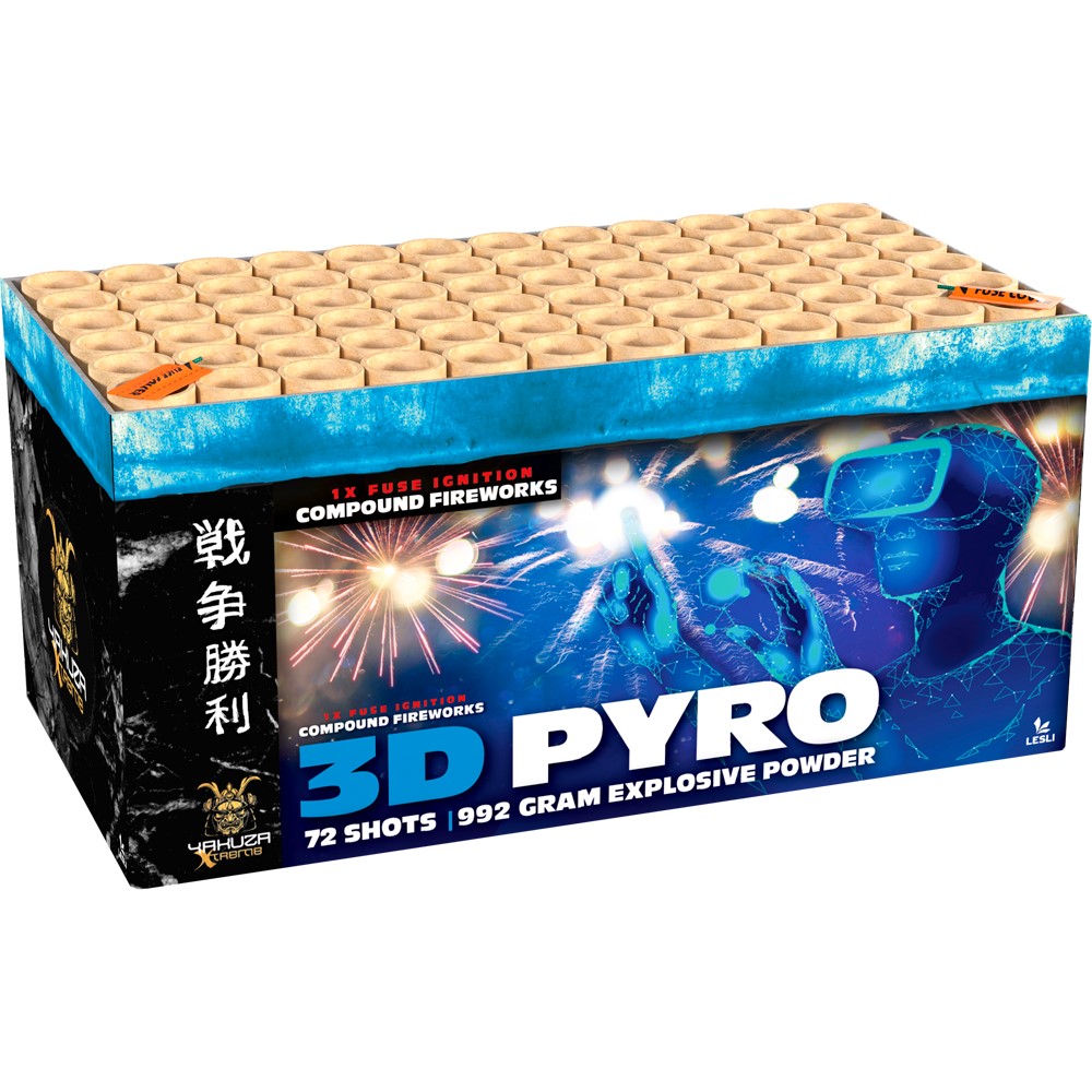 3D PyroStellen Sie sich vor, Sie wären in der Welt der Pyrotechnik mit diesem 72-schüssigen Compound. Flashy Schweife explodieren in Camuro Effekten mit hellen Neon Blinkern. In den zweiten Phasen scheinen die Effekte zu verschwinden und kommen dann doch wieder! |