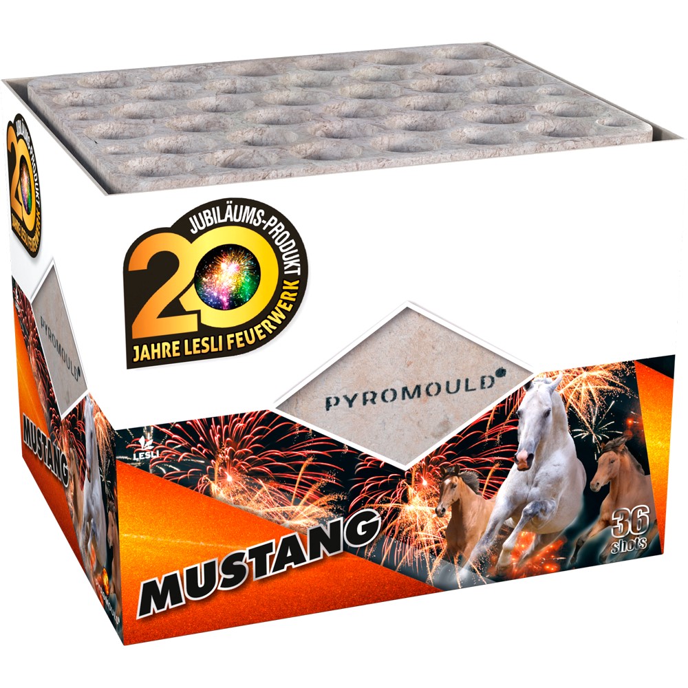 MustangEr ist wieder da! Der Mustang beginnt ruhig mit knisternden Kokosnuss Effekten. Unmittelbar danach geht es los. Aus zweier-salven werden bunte Effekte in einer guten Steighöhe in die Luft geschleudert. Prächtiges oranges Finale. 36-Schuss. |